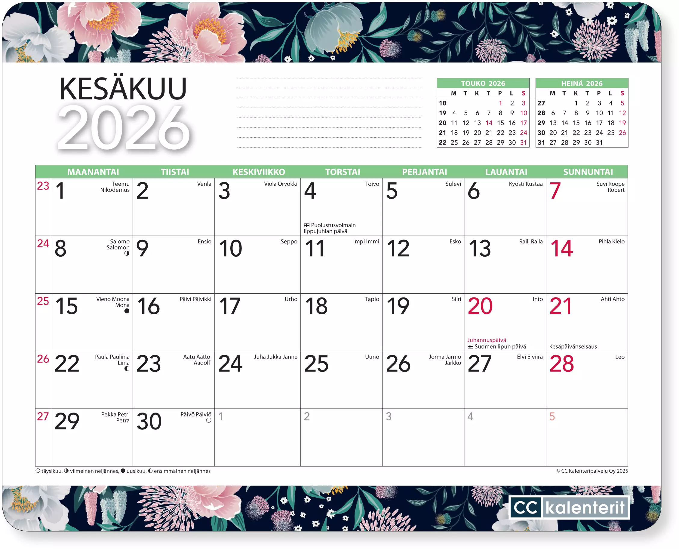 Poista kulunut kuukausi ja sinulla on aina ajantasalla oleva hiirimatto pöydälläsi! Koko 215 x 175 mm. Tukeva ja helposti sivulta avattava hiirimatto, jonka sisällä on 12-lehtinen kuukausikalenteri. Liputuspäivät ja nimipäivät. Kukin kuukausi on omalla nelivärisellä irrotettavalla lehdellään. Suomenkielinen.