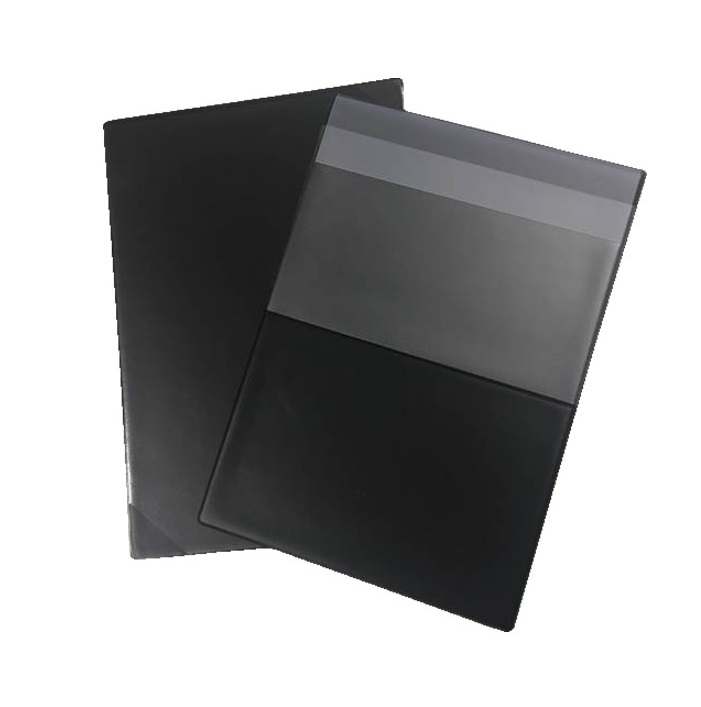Huoltotasku A4 Kova, taittamaton, musta taustamuovi. Muovitasku aukeaa yhdeltä lyhyeltä ja pitkältä sivulta. Taustan takana A5 muovitasku läpällä.