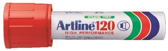 tussi 20 mm kirjoitusleveydellä ja suoralla kärjellä. Nopeasti kuivuva, vedenpitävä, alumiinirunko, uudelleen täytettävä alkoholipohjainen kestomuste ilman ksyleeniä.