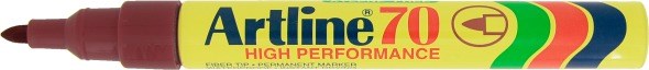 Artline 70 on luodinkärkinen pysyvä tussi, jossa on erittäin vahva alumiinirunko.kärjen kirjoitusleveys 1,5 mm. Artline 70 markkeri sisältää turvallisen ksyleenittoman alkoholiliuotinpohjaisen musteen, joka kuivuu nopeasti ja on vedenkestävä. Nämä tussit soveltuvat käytettäväksi useimmilla pinnoilla, mukaan lukien paperi, pahvi, muovi, metalli ja lasi.