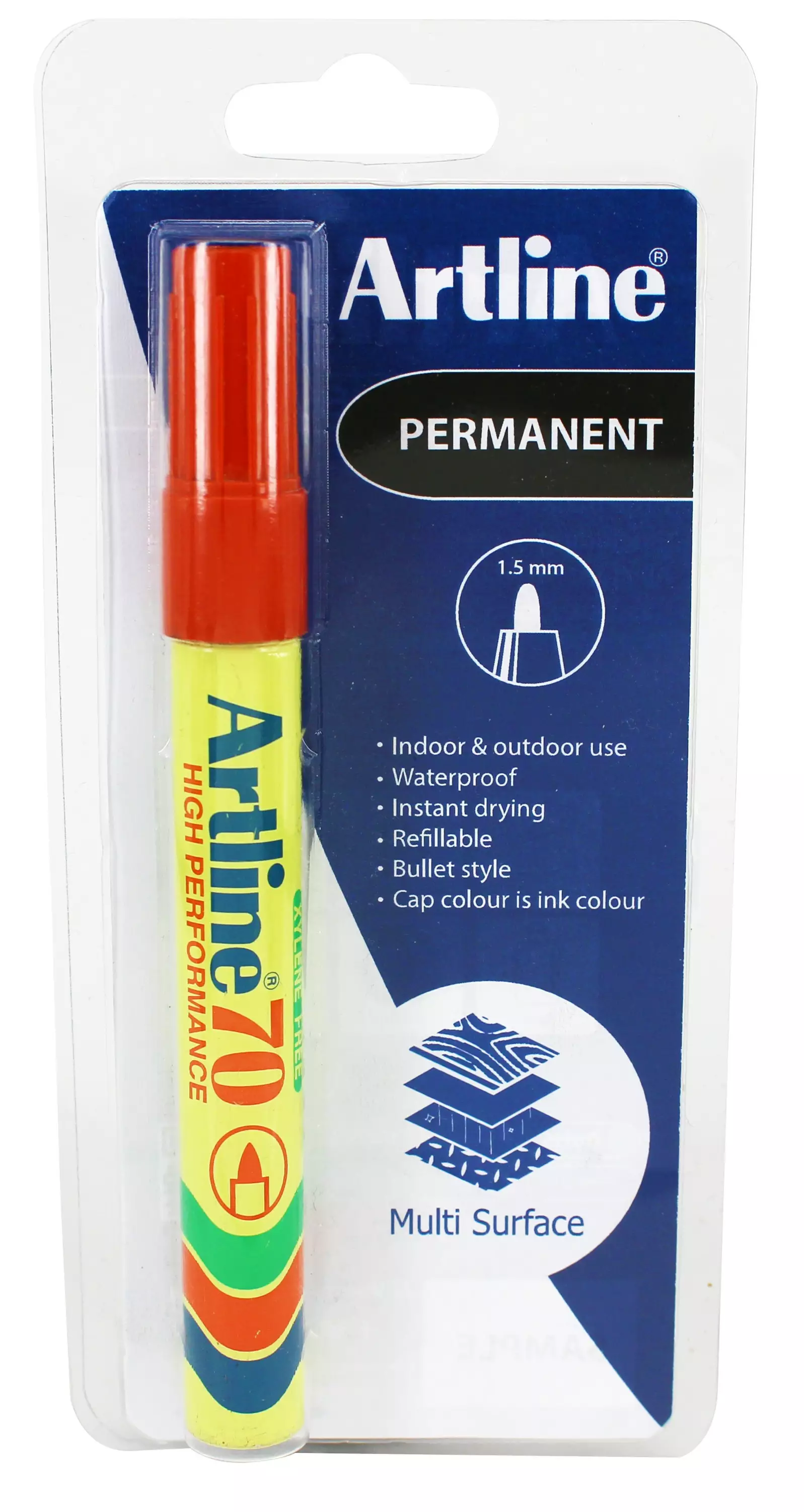 Artline 70 on luodinkärkinen pysyvä tussi, jossa on erittäin vahva alumiinirunko.kärjen kirjoitusleveys 1,5 mm. Artline 70 markkeri sisältää turvallisen ksyleenittoman alkoholiliuotinpohjaisen musteen, joka kuivuu nopeasti ja on vedenkestävä. Nämä tussit soveltuvat käytettäväksi useimmilla pinnoilla, mukaan lukien paperi, pahvi, muovi, metalli ja lasi.