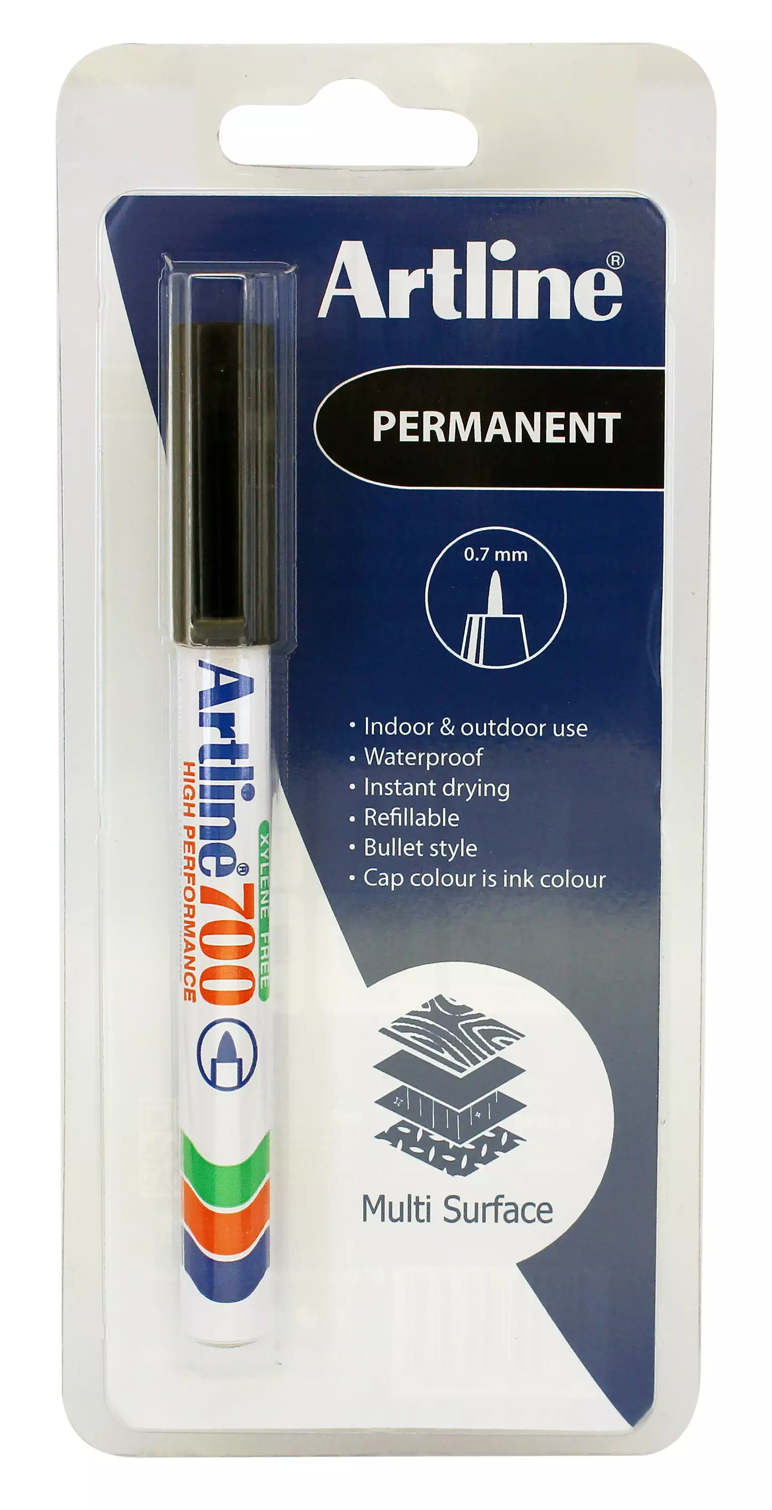 Pysyvä tussi 0,7 mm pyöreällä kärjellä. Nopeasti kuivuva, vedenpitävä, alumiinirunko, uudelleen täytettävä alkoholipohjainen kestomuste ilman ksyleeniä. Väri: Musta.