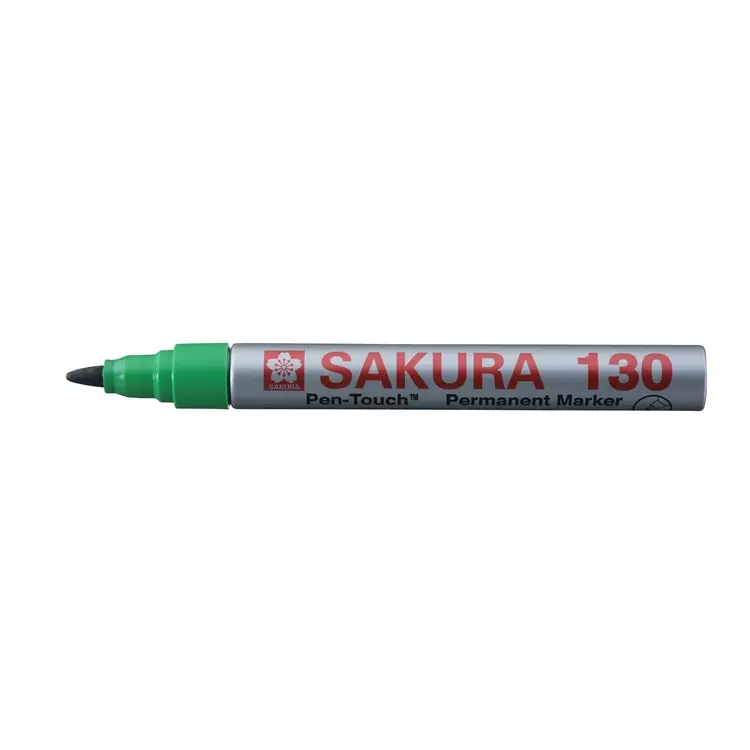 Sakura Pen-Touch 130 -huopakynän pysyvä ja taatusti näkyvä väriaine sisältää xyleeniä, joka tekee siitä erittäin voimakkaasti kiinnittyvän. Kynä tarttuu niin kumi-, metalli-, lasi-, kivi-, puu-, sementti-, posliini- kuin muovipintoihinkin (ei kuitenkaan styroxiin) ja kärki kestää kovaakin käyttöä. Spriiliukoinen muste kestää vettä ja haalistumista. Huom! Muste ei ole pysyvää lasi- tai keramiikkapinnoilla. Musteen väri: vihreä Kärki: pyöreä Viivan leveys: 1,2 mm