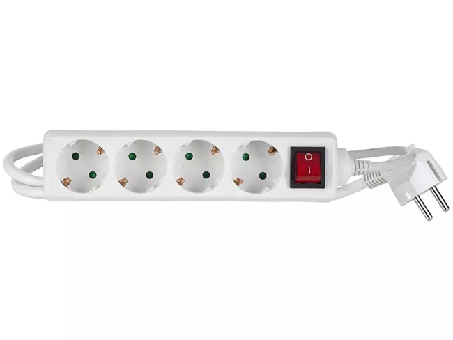 Airamin maadoitettu ja lapsisuojattu, kytkimellä ja merkkivalolla varustettu 4-osainen jatkojohto sisäkäyttöön. Pistokkeet ovat 45 ° kulmassa. Johdon pituus: 1,5 m Kaapeli: H05VV-F / 3 x 1,5 mm² Kotelointiluokka: IP20