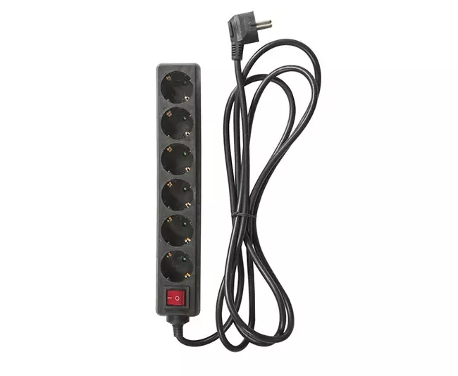 Airamin maadoitettu ja lapsisuojattu, kytkimellä ja merkkivalolla varustettu 6-osainen jatkojohto sisäkäyttöön. Pistokkeet ovat 45 ° kulmassa. Johdon pituus: 3 m Kaapeli: H05VV-F / 3 x 1,5 mm² Kotelointiluokka: IP20 Väri: musta