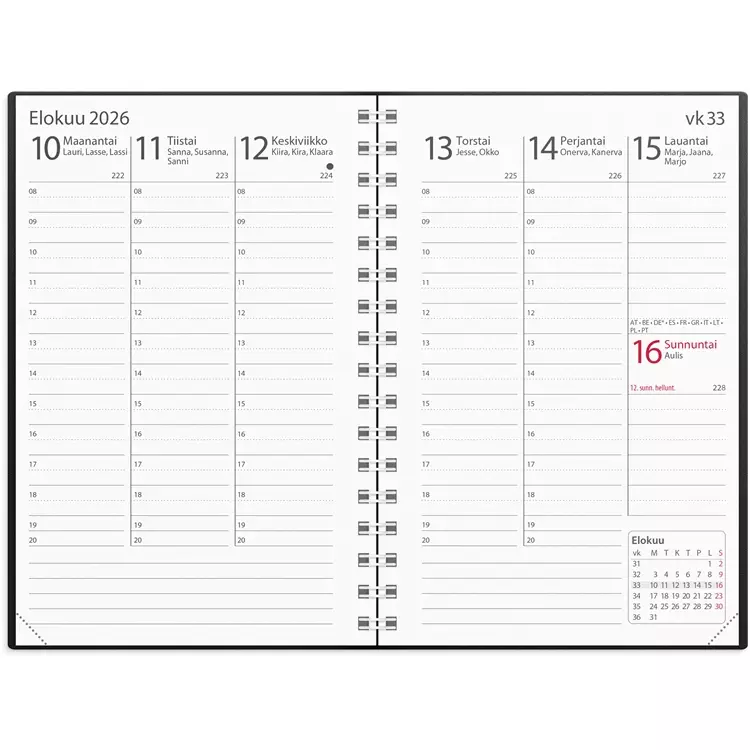 Kalenterin aukeamalla yksi viikko, tuntijaotus 08-20 ja kuluvan kuukauden kalenteritaulukko. Kalenteri sisältää nimipäivät, kansalliset pyhäpäivät, liputuspäivät, kuun vaiheet, kalendaariset tiedot, vuosisuunnitelmat kuluvalle ja seuraavalle vuodelle, vuosiruudukot kuluvalle ja seuraavalle vuodelle sekä erillisen muistilehtiön. Kalenteriosa: vk 50 2025-vk 53 2026/2027. Suomenkielinen. Parikierresidottu. FSC®. Koko: 83x127 mm.