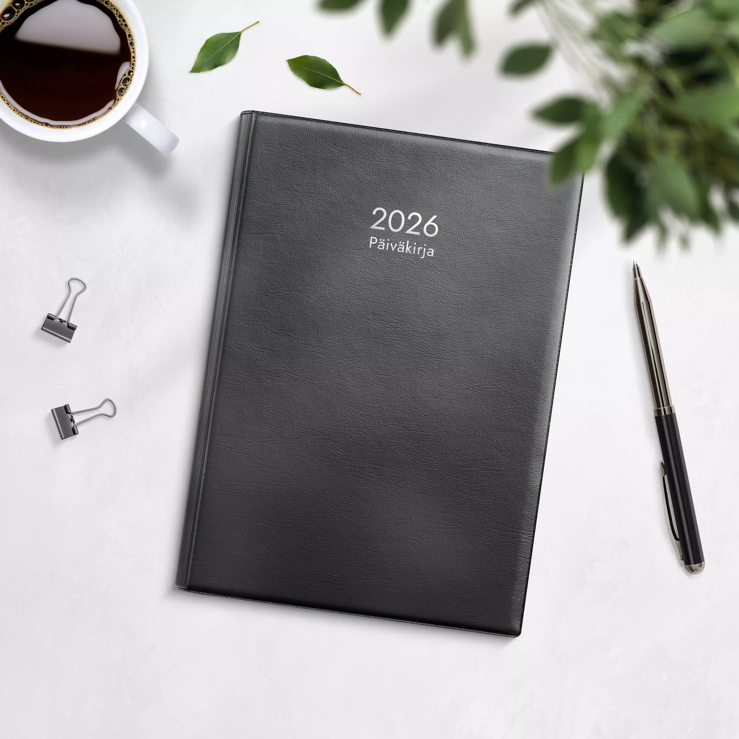 Kalenteri 2026 Päiväkirja musta muovikansi parikierresidottu