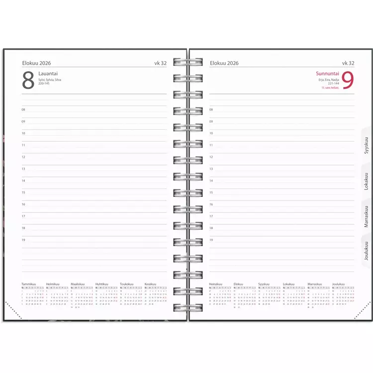 Painettu kartonkikansi. Kalenterin aukeamalla kaksi päivää, tuntijaotus 08-19, reilusti muistiinpanotilaa ja koko vuoden kuukausitaulukot. Kalenteri sisältää nimipäivät, kansalliset pyhäpäivät, liputuspäivät, vuosisuunnitelmat kuluvalle ja seuraavalle vuodelle, kalendaariset tiedot, auringon nousu- ja laskuajat, yleiset pyhäpäivät Euroopassa ja muistiinpanosivut. Kalenterissa kuukausilovitus ja joka kuukausi alkaa kuukausisuunnitelmalla. Kalenteriosa: 01.01.2026 - 31.12.2026. Suomenkielinen. Parikierresidottu. FSC®. Koko: 135x205 mm.