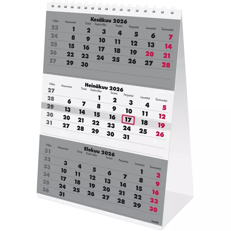 Burden Triplaner on helposti koottava pöytäkalenteri vuodelle 2026, joka vie vain vähän tilaa. Kalenterissa on 12 sivua, joista jokaisella näkyy kolmen kuukauden kalendaario, jossa kuluva kuukausi löytyy keskeltä. Mukana tulee myös siirrettävä päiväosoitin.
