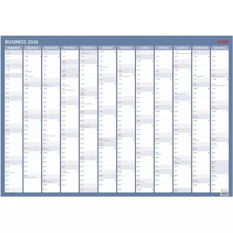 Burden Seinälehti Business on suurikokoinen ja selkeä suunnitelmakalenteri, jossa on muistiinpanotilaa jokaiselle vuoden 2026 päivälle. Kalenteri sisältää liputuspäiviä, valittuja kirkkopyhiä ja juhlapyhiä. Kääntöpuolella on suomen- ja ruotsinkieliset pienennetyt kalenterit.