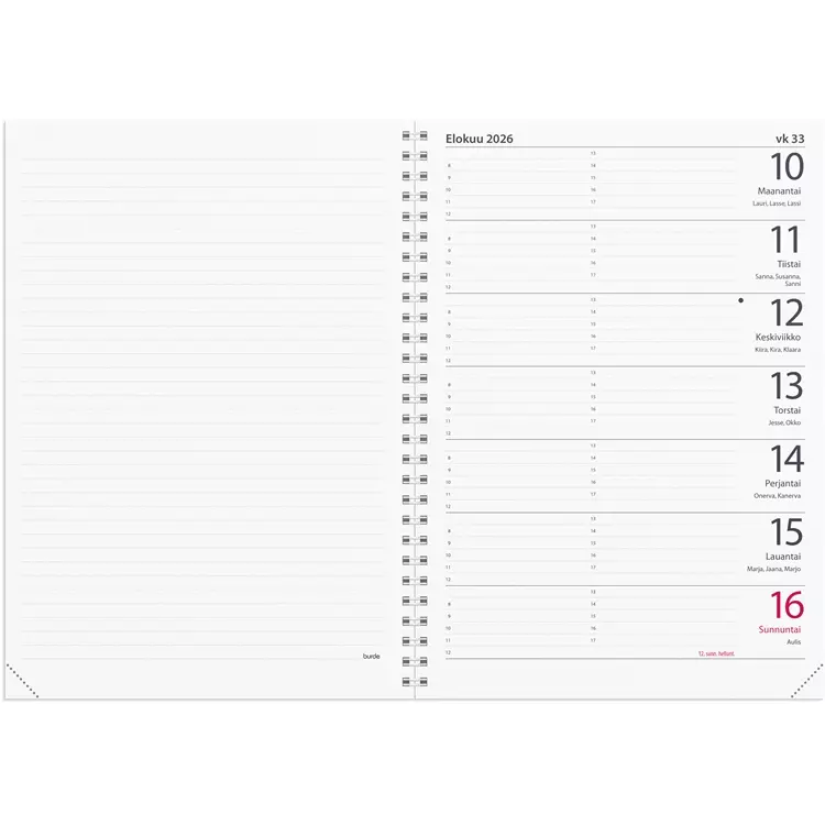 Kannessa neljä luottokorttitaskua, yksi suurempi tasku ja kynänpidike. Kalenterin aukeamalla toinen sivu kalenteriviikko tuntijaotuksella 08-17 ja toinen viivoitettu muistiinpanoja varten. Kalenteri sisältää nimipäivät, kansalliset pyhäpäivät, liputuspäivät, kuun vaiheet, vuosisuunnitelman seuraavalle vuodelle sekä irrallisen vuosisuunnitelman kuluvalle vuodelle ja vuosiruudukot edelliselle, kuluvalle ja seuraavalle vuodelle. Kalenteriosa: vk 52 2025-vk 53 2026/2027. Suomenkielinen. Parikierresidottu kalenteri. FSC®-paperi. Koko: 148x210 mm (A5).