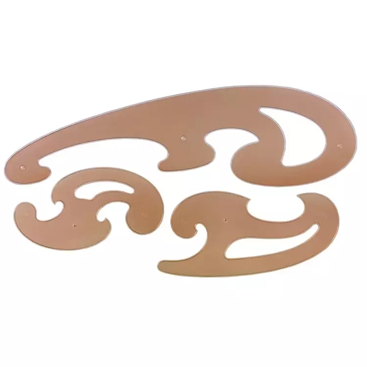 Kolmiosainen käyräsarja piirtäjille. Koot 210, 160 ja 130 mm. Kaksiportainen reuna. Materiaali värjättyä, läpinäkyvää muovia.