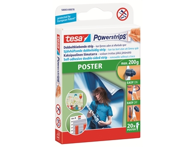 tesa 58003 kaksipuoliset kiinnitysliuskat sopivat julisteiden tai piirustusten kiinnittämiseen aina 200 g saakka.. Voidaan irrottaa jälkiä jättämättä. Julisteita voidaan vaihtaa tai järjestää niitä uudelleen. Pinnat ja julisteet säilyvät ehjinä. Helppo käyttää ja irrottaa ilman liimajäänteitä.