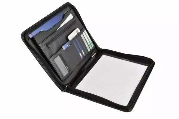 Desq Kokouskansio A4, keinonahka, musta. Monikäyttöinen keinonahkainen vetoketjulla suljettava kokouskansio. Kansiossa tilaa mm kirjoituslehtiölle ja kynälle sekä käyntikorteille. Vetoketjukiinnitys takaa, ettei mitään pääse putoamaan. Koko 36 x 2,5 x 25 cm.