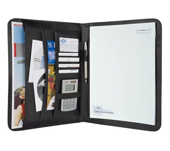 Monipuolinen kokouskansio mustaa keinonahka/nylon kangas päällyste. Kynäpidike, A4- lehtiölle paikka, A4-kopioille tilaa, 2 erillistä taskua kokousmateriaalille, käyntikorteille 4 taskua + 1 ikkunatasku, laskimelle kumilenkkipidike. Mitat: n.33x3x25cm.