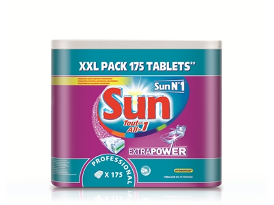 Konetiskitabletti Sun Professional ALL-IN-1 XXLSun Professional All in 1 Extra Power konetiskitabletissa on kaikki yhdessä tabletissa; pesu, huuhtelukirkaste, suola, lasin- ja koneen suoja. Sun Professional Extra Power poistaa tehokkaasti kuivunutta ruokaa ja likaa, joten esipesua ei tarvita ja puhdasta syntyy jo alhaisessa lämpötilassa.