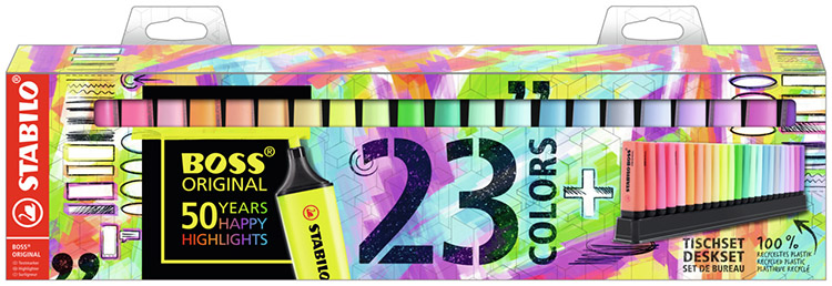 Stabilo Boss korostuskynä juhlavuosipakkauksessa. 23 kpl pöytätelineessä, 14 pastellisävyä ja 9 fluorisoivaa väriä. Litteä kärki, kärjen leveys 2/5 mm. Myrkytön väriaine.