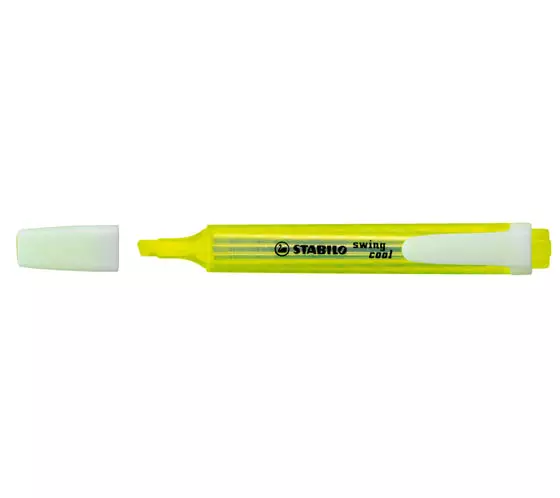 Stabilo Swing Cool on tavanomaista korostuskynää kapeampi ja sirompi. Korkealaatuinen, vesipohjainen ja myrkytön fluoresoiva muste juoksee kevyesti viistosta kärjestä, jonka kahdella eri kirjoitusleveydellä sekä alleviivaat että korostat. Kynä ei kuivu neljään tuntiin, vaikka korkki unohtuisi auki. Kynässä on myös taskuklipsi.