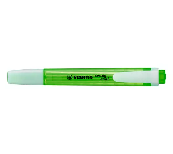 Stabilo Swing Cool on tavanomaista korostuskynää kapeampi ja sirompi. Korkealaatuinen, vesipohjainen ja myrkytön fluoresoiva muste juoksee kevyesti viistosta kärjestä, jonka kahdella eri kirjoitusleveydellä sekä alleviivaat että korostat. Kynä ei kuivu neljään tuntiin, vaikka korkki unohtuisi auki. Kynässä on myös taskuklipsi. Musteen väri: vihreä Kärki: viisto Viivan leveys: 1 + 4 mm