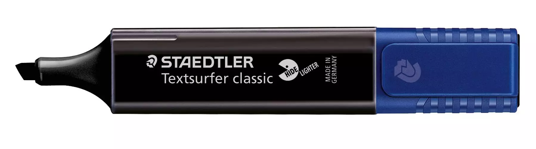 Korostuskynä, jossa on suuri mustesäiliö erittäin pitkäkestoiseen käyttöön. Musta korostuskynä peittää tekstin ja viivat, mutta ne pysyvät silti luettavina ja lukukelvottomina kopioinnin jälkeen. Vesipohjainen muste. Nopeasti kuivuva. Kierrettävä korkki helpottaa avaamista. PP-runko ja korkki takaavat pitkän käyttöiän. Lentokoneturvallinen - automaattinen paineentasaus estää kynän vuotamisen lentokoneessa. Erittäin pehmeä viistekärki, noin 1–5 mm.
