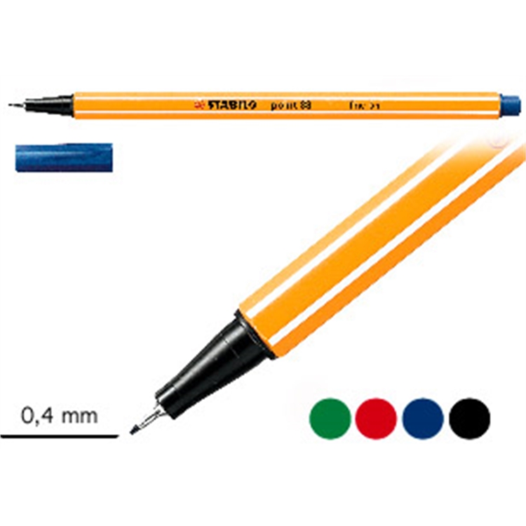 Kuusikulmainen Stabilo point 88 -kuitukärkikynä on klassikko. Ohut neulamainen kärki, viivan leveys 0,4mm. Kynä ei kuivu 2-3 päivään vaikka olisi ilman korkkia. Sininen muste.