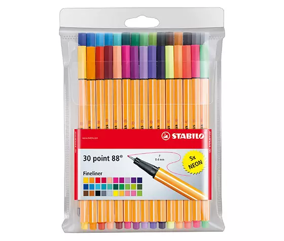 Stabilo Point 88 on ajaton klassikko, jonka valkoiset raidat keltaisella kuusikulmaisella rungolla tunnistat varmasti. Kuitukärkikynä soveltuu yhtä hyvin niin kirjoittamiseen kuin piirtämiseenkin. Metalliseen vaippaan kiedottu kapea ja tarkka kärki sopii hyvin mm. viivottimien kanssa toimimiseen. Muste on vesiliukoista, ja kynä ei kuivu 2-3 päivään, vaikka unohtaisit korkin auki. Korkki on ventiloitu. Musteen väri: värilajitelma Viivan leveys: 0,4 mm Muovisessa blisterpakkauksessa on 25 perus- ja 5 neonvärin lajitelma, yhteensä 30 kynää.