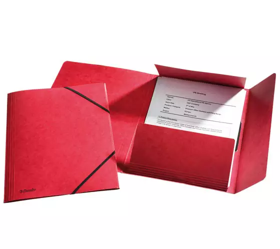 Valmistettu 390g kartongista. Koko 240 x 5 x 320 mm. Mustat kuminauhat. Kapasiteetti 350 sivua 80g paperia. Väri: punainen.