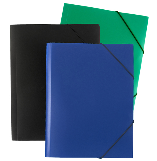 Kulmalukkosalkku A4. Värit: musta, sininen, vihreä. Kulmakuminauhasuljenta, 3 läppää, polypropeenia (PP).