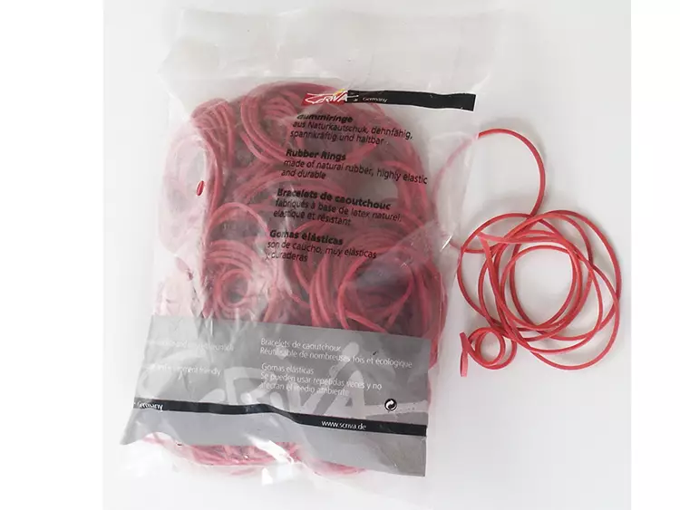 Punainen kuminauha muovipussissa. Halkaisija 95mm, pituus litteänä 150mm. Leveys 2mm. Luonnonkumia. 100 g/pussi.