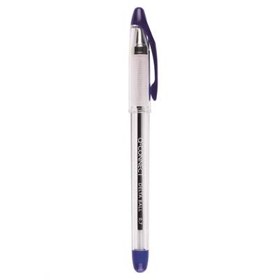 Medium-kärki (viivan leveys 0.7 mm). Metallikärki, muovitulppa klipsillä. Kuminen kirjoitustuki. Läpinäkyvä runko.