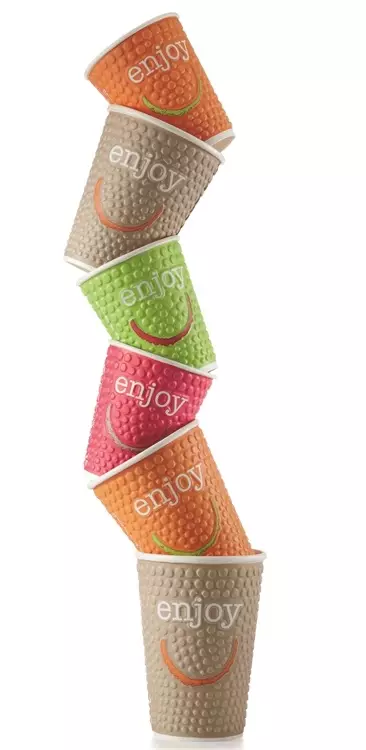 Kohokuvioinen, iloisen värinen ja hymyilevä kuumakuppi tuo päivään piristystä. Tuplakerroksen ja kohokuvion ansiosta juoman kuumuus ei tule sormiin läpi. 4 värin lajitelma: punainen, oranssi, vihreä ja beige.