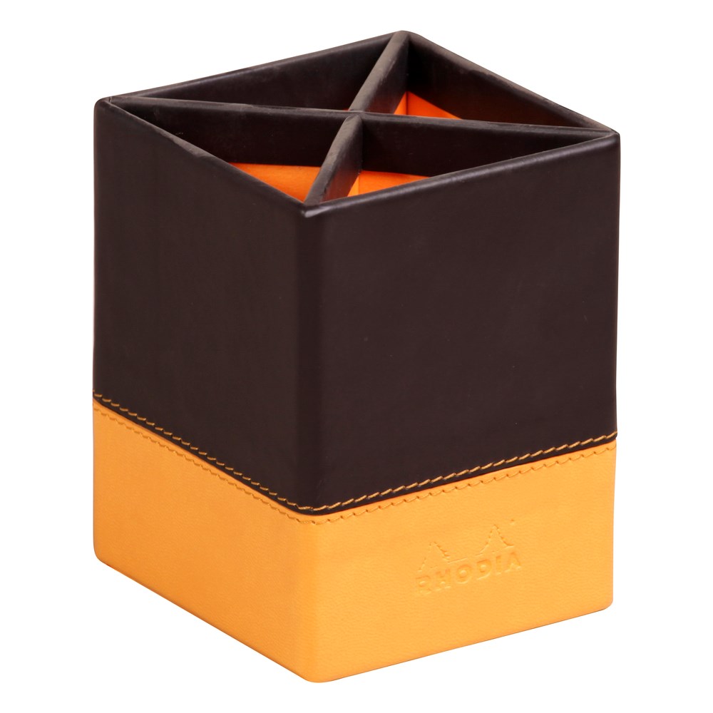 Lyijykynäteline, joka on valmistettu italialaisesta keinonahasta, jossa on kohokuvioitu Rhodia-logo.