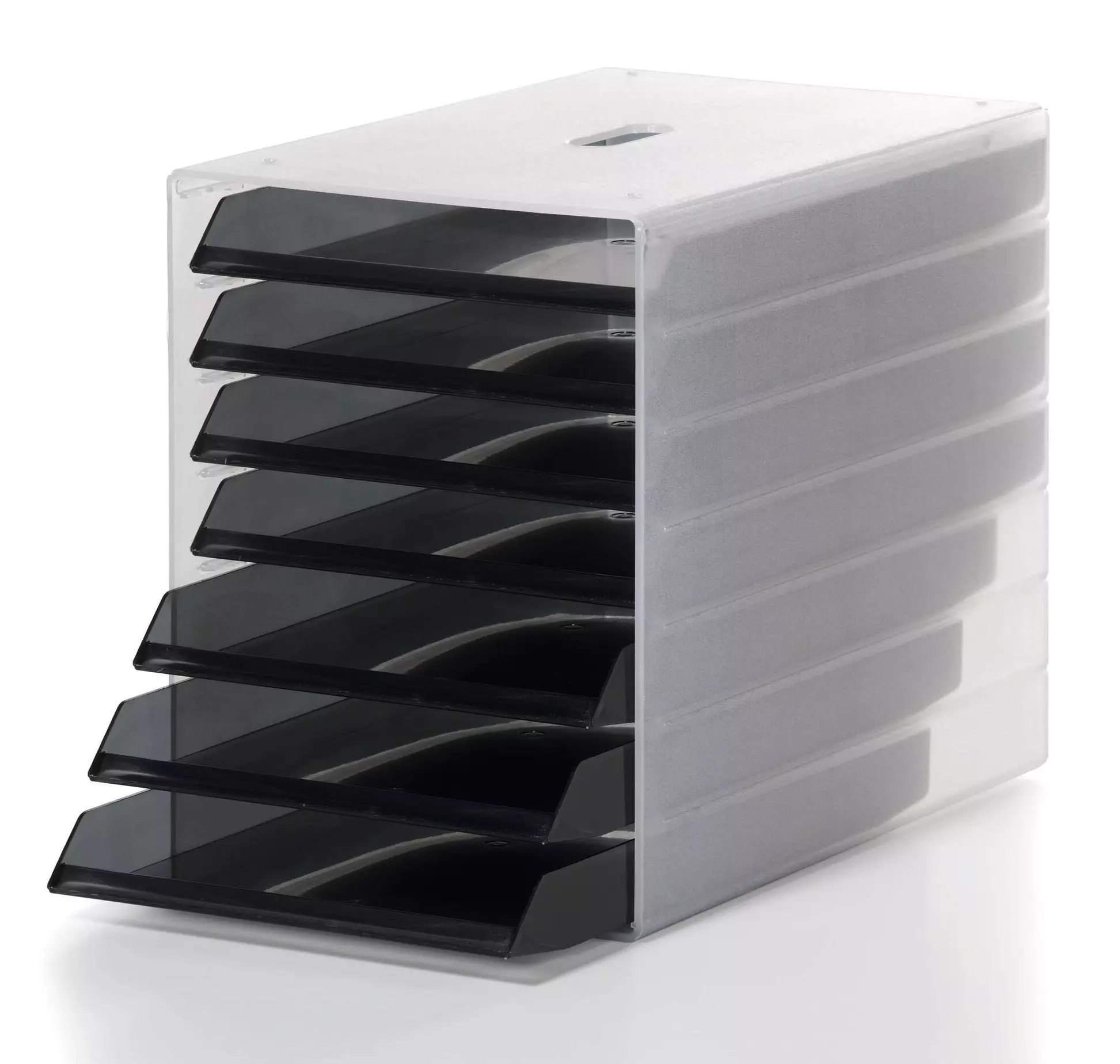 7-osainen vetolaatikosto. Harmaa, kirkas runko ja vetolaatikot. Voidaan kiinnittää myös seinälle. Mitat 365 (s) x 250 (l) x 322 (k) mm.