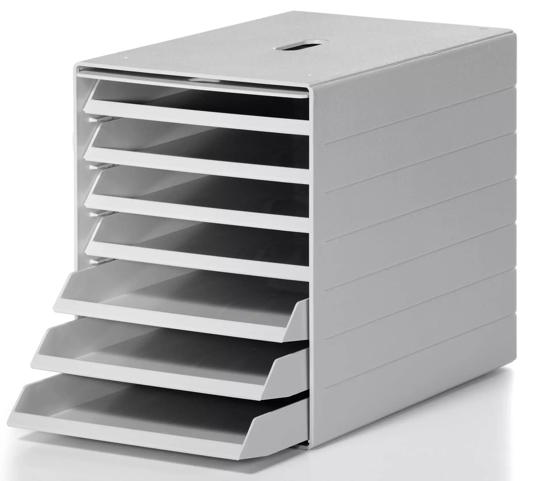 Durable Idealbox Plus säilytyslaatikosto asiakirjojen säilyttämistä varten, liu´tetteva etukansi. Voidaan asentaa pöydän päälle tai alle ja seinälle. Sisältää 7 C4 kokoista alustaa. Mitat: 365 x 250 x 322 mm (S x L x K).