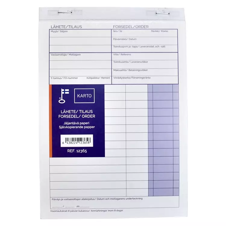 Lähete/tilauslomakelehtiössä on 50 repäistävää lehteä jäljentävällä paperilla. Kotimaisella tuotteella on Avainlippu. Mitat: A5 Sivumäärä: 50 lehteä Kielet: suomi ja ruotsi