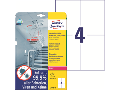 Averyn läpinäkyvät, antimikrobiset kalvotarrat L8013-10, joiden muoto on 105x148mm, poistavat 99,9% kaikista viruksista, bakteereista ja bakteereista ja ovat erityisen säänkestäviä ja kestäviä.