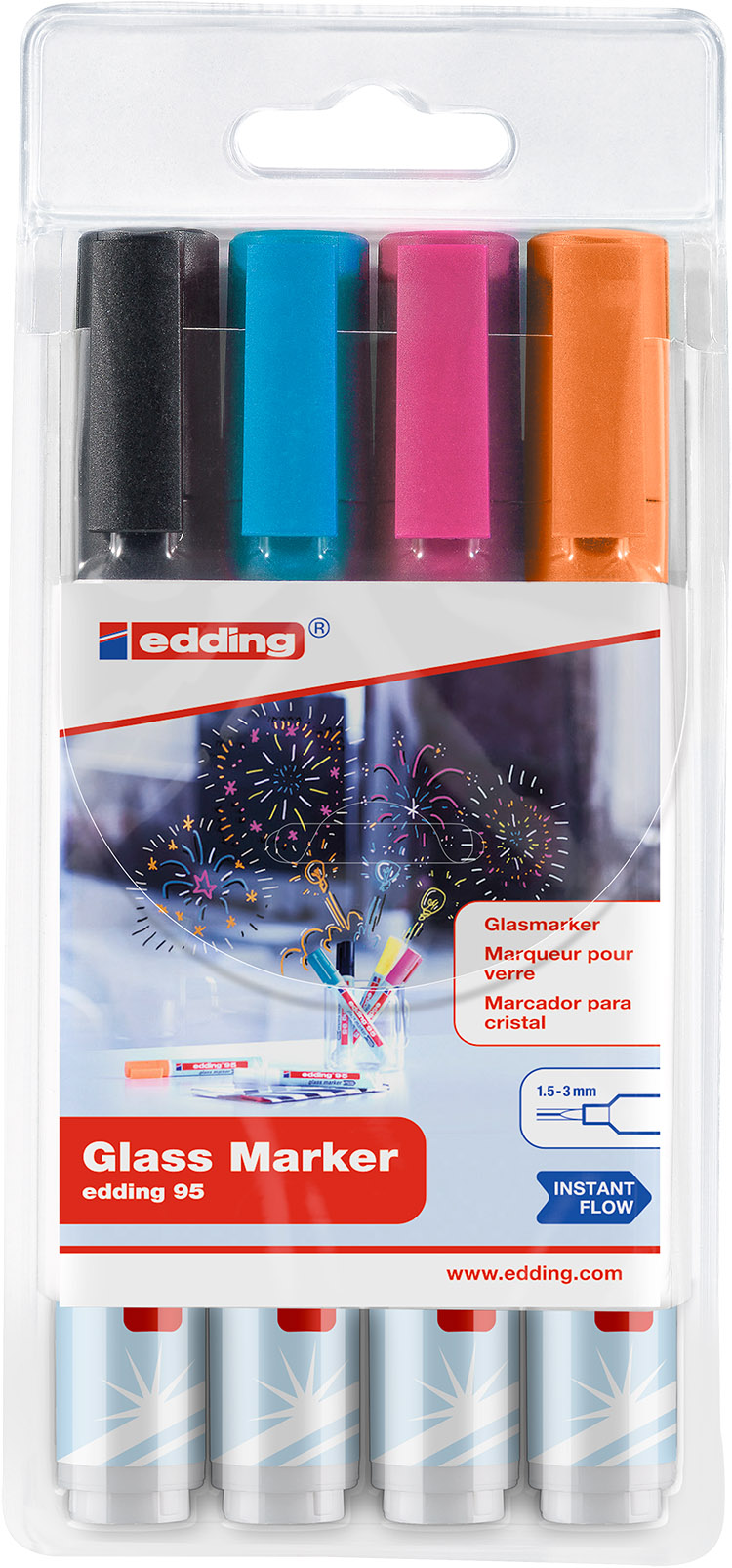 Edding lasitussi sopii useimmille lasipi lasipinnoille, myös lasisille valkotauluille. Heti käyttövalmis. Kuivapyyhittävä. Pyöreä kärki, viiva 1,5-3mm. Setissä musta, pinkki, oranssi, vaaleansininen.