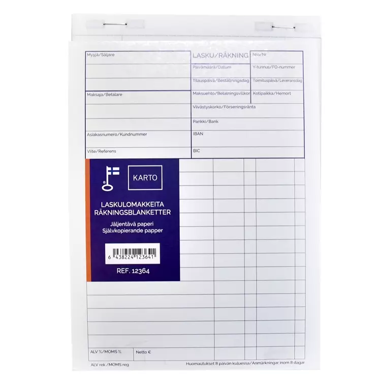Laskulomakelehtiössä on 50 repäistävää lehteä jäljentävällä paperilla. Kotimaisella tuotteella on Avainlippu. Mitat: A5 Sivumäärä: 50 lehteä Kielet: suomi ja ruotsi