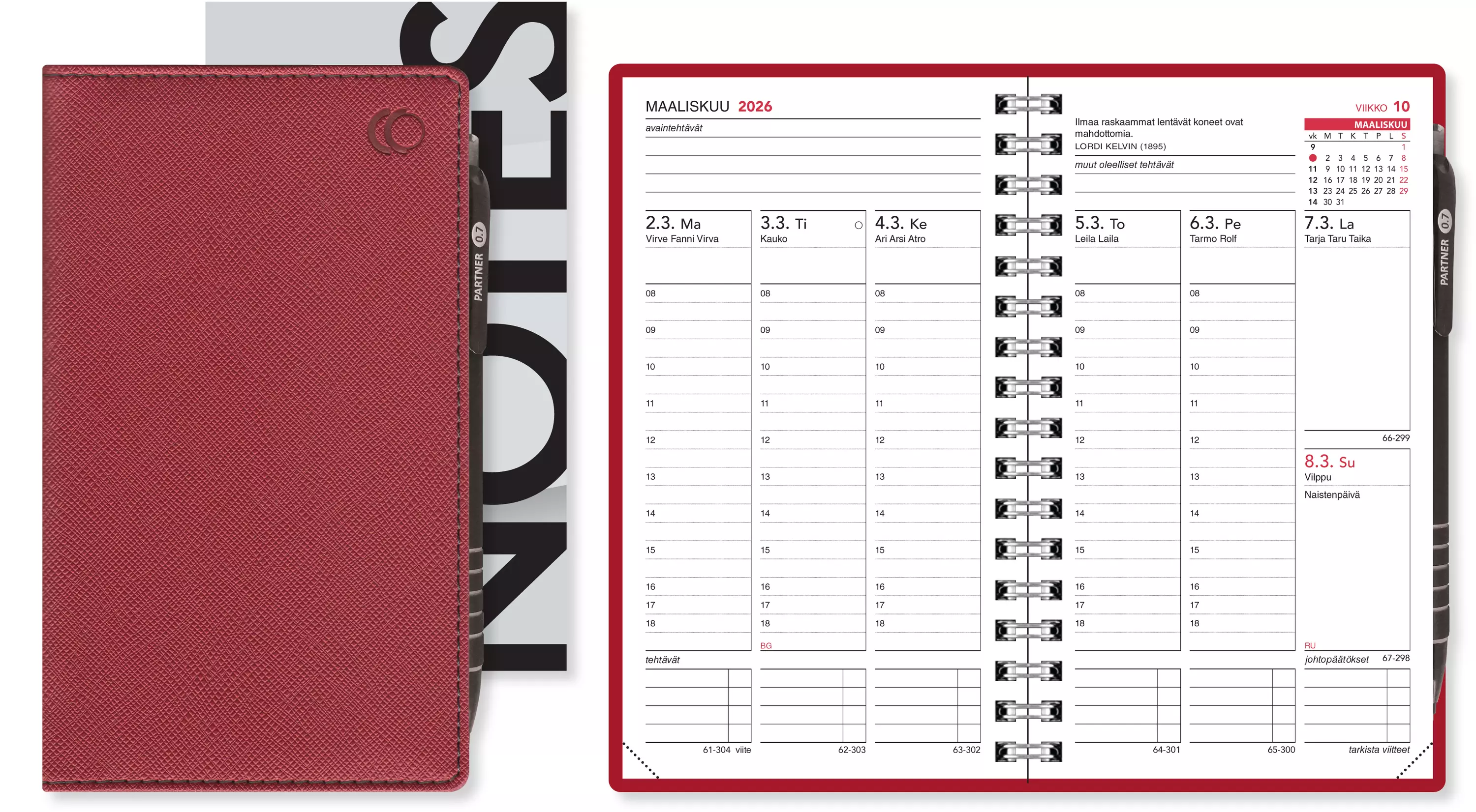 Suosittu Leader-kalenteri monipuoliseen ajan ja asioiden järjestämiseen. Selkeä viitejärjestelmä, runsas sisältö ja laajat muistiinpanomahdollisuudet projekteihin ja kokouksiin. Erilliset tehtäväluettelot ja kalenteriosa kestävissä ja nykyaikaisissa kansissa helpottavat käyttöä. Kansissa voi tarvittaessa säilyttää myös kuitteja ja muita papereita. Leader tunnetaan myös iskevistä arjen aforismeistaan. Koko 87 x 153 mm, viikot 42/2025-1/2027, kuukausi- ja projektisuunnittelusivut 2026 ja 2027, monikäyttöinen viitelomakkeisto. Aukeamalla viikko, tunnit 8-18, liputuspäivät, kansalliset pyhät aukeamilla ja luettelona, nimipäivät. Wiresidottu, kulmaperforoitu. Huippulaadukas keinonahkakansi on aina pehmustettu, sisävuorattu ja reunaommeltu. Suomenkielinen. Keinonahkakansissa on kalenterin lisäksi mukana myös siirrettävä Notes-muistio. Kansia voi käyttää useamman vuoden niiden kestävän rakenteen ansiosta. Seuraavana vuonna tarvitset vain vuosipaketin.