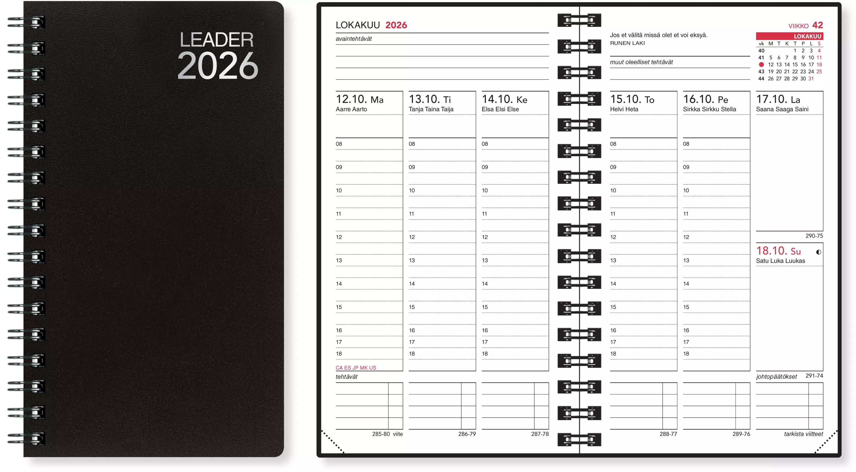 Leader-kalenteri kestävissä ja tukevissa polypropeenikansissa. Sopii käyttöön myös sellaisenaan. Käy myös muiden kustantajien kansiin. Koko 87 x 153 mm, viikot 42/2025-1/2027, kuukausi- ja projektisuunnittelusivut 2026 ja 2027, monikäyttöinen viitelomakkeisto. Aukeamalla viikko, tunnit 8-18, liputuspäivät, kansalliset pyhät aukeamilla ja luettelona, nimipäivät. Wiresidottu, kulmaperforoitu. Suomenkielinen.