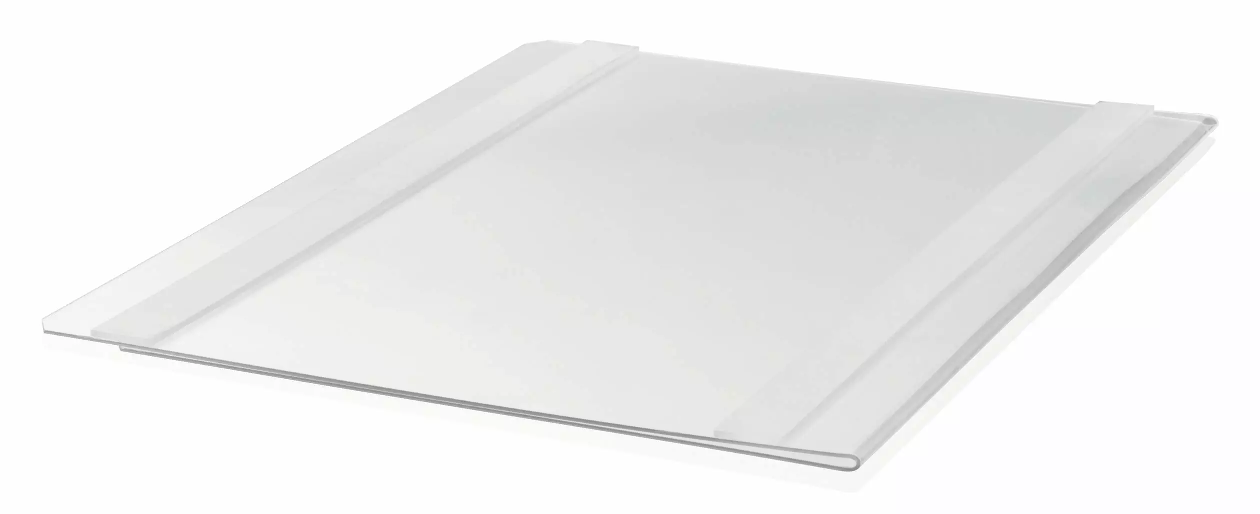 Läpinäkyvästä PET-muovista valmistettu asiakirjatasku, jossa on kaksi pysyvää tarranauhaa asiakirjapidikkeen takaosassa.