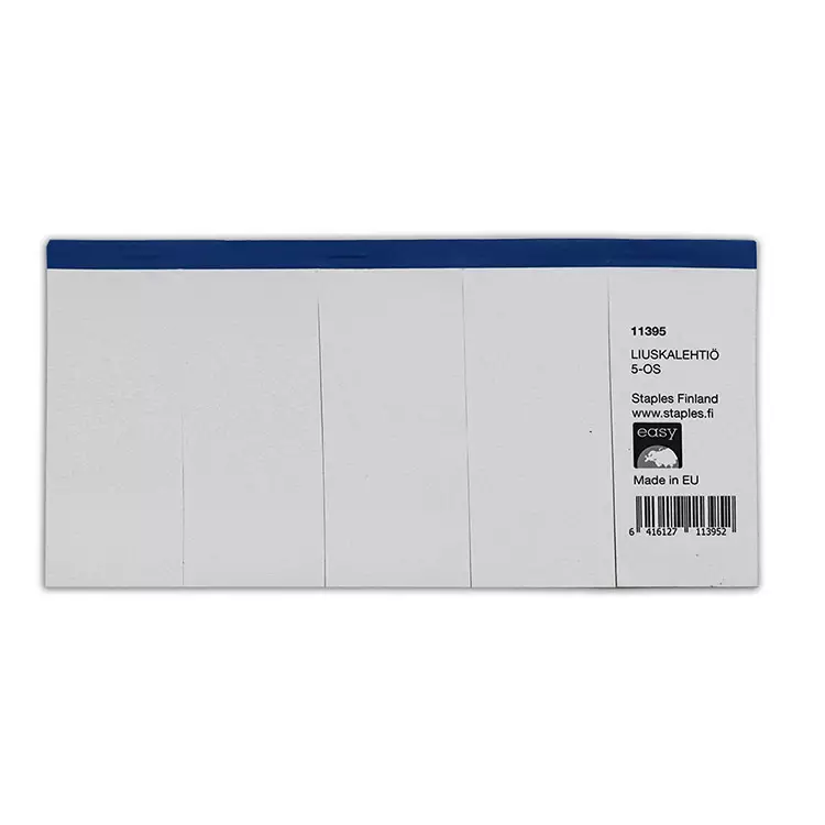 Nidotussa ja perferoidussa liuskalehtiössä on viisi vierekkäistä saraketta irtirepäistäviä valkoisia liuskoja muistiinpanoja ja viestejä varten. Blanko paperi.