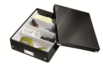 Leitzin Click&Store -lokerikkolaatikko on joustava säilytyslaatikko kaikkiin säilytystarpeisiin. A4-kokoinen laatikko voidaan halutessa jakaa 2-4 osastoon.