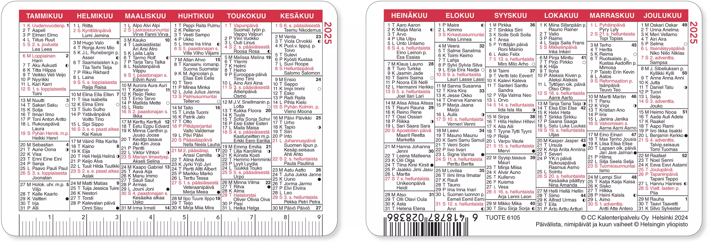 Käytännöllinen, kestävä ja lompakkoon mahtuva. Koko 100 x 70 mm, puoli vuotta puolellaan. Liputuspäivät, kansalliset pyhät, nimipäivät, kuun vaiheet. Pyöristetyt kulmat, mittaviivoitus, laminoitu kartonki. Suomenkielinen.