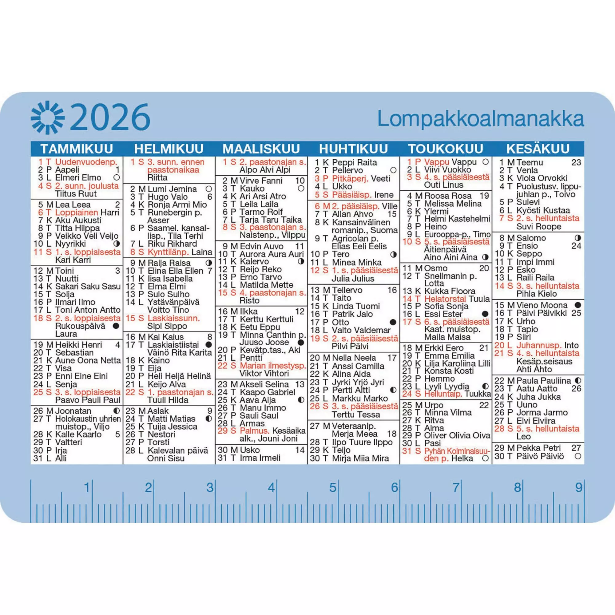 Ajasto Lompakkoalmanakka 2026 on ohuen ohut vuosikalenteri, joka sujahtaa lompakkoon tai taskuun. Kalenteri näyttää puolen vuoden jakson per puoli ja toisella reunalla on kätevä viivain. Tämä ohut kalenteri on helppo pitää matkassa ja pysyt aina ajan tasalla. Ajasto Lompakkoalmanakka 2026 tärkeimmät ominaisuudet: lompakkoon sopiva koko 100 x 70 mm. puolen vuoden jakso per puoli. kirkkopyhät. juhlapyhät. runsaasti nimipäiviä. viivain.