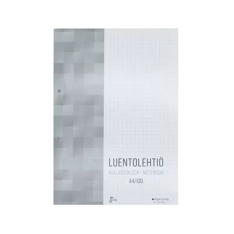 Koko A4. 100 lehteä. Etukansi kartonkia ja takakansi pahvia. Ruudutus 7x7 mm. Liimasidottu vasemmalta pitkältä sivulta. Vasemmalla pitkällä sivulla lisäksi 8 cm (kaksi reikää 8 cm välein) tai 8-12 cm (4 reikää, joista kaksi 8 cm välein ja kaksi 12 cm välein) rei'itys. Paperin neliömassapaino 60g/m2. Tuotteella on joutsenmerkki.