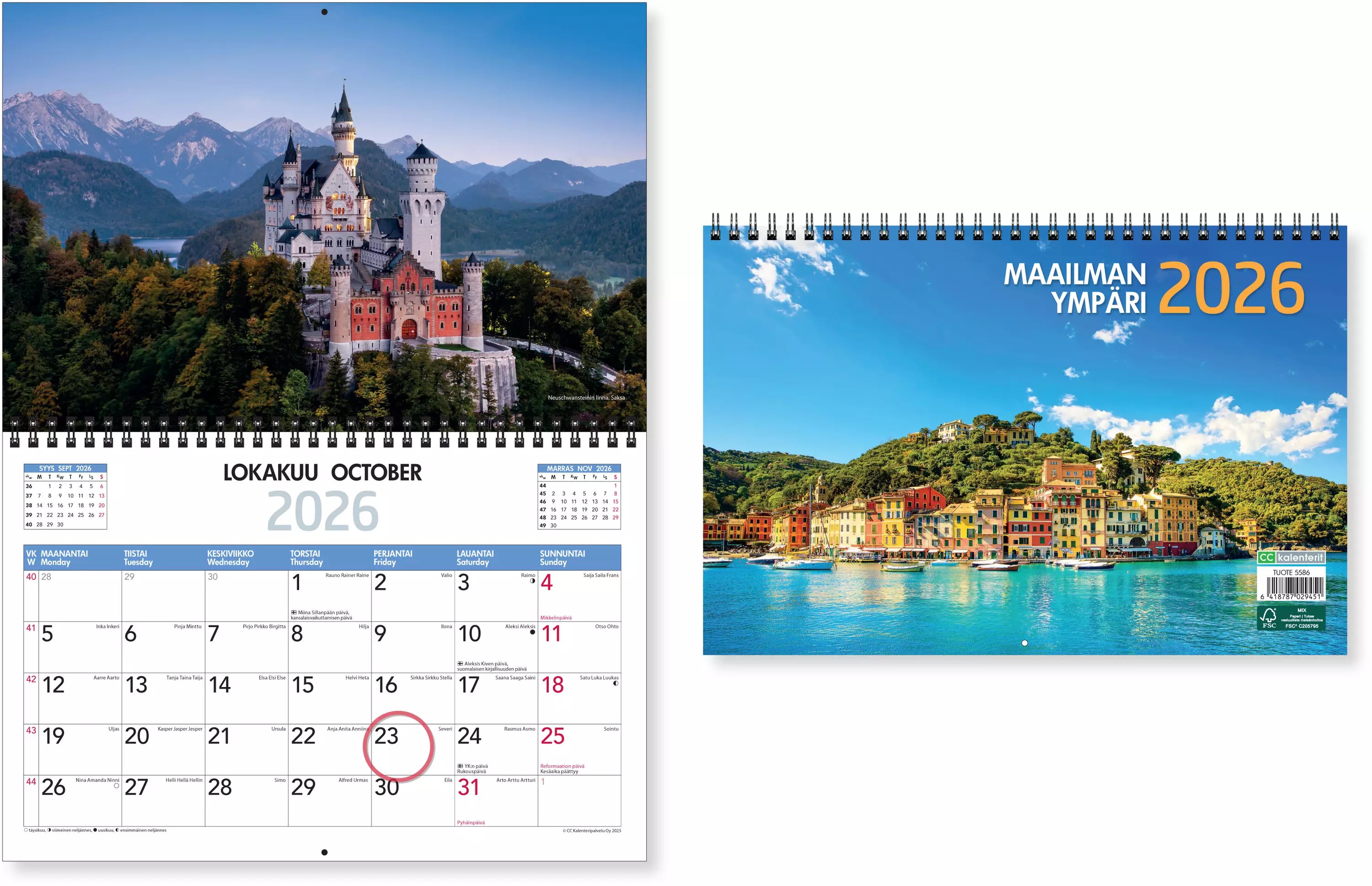 Lomakuvia läpi vuoden! Koko avattuna 300 x 400 mm, 12 kuukautta, edellisen ja seuraavan kuukauden seuranta, nimi- ja juhlapäivät, kuun vaiheet. Päiväkohtaista kirjoitustilaa. Lisäksi 2027-vuosikalenteri. Wiresidottu, ripustusreikä, staattinen päiväjuoksija. Kieliasu suomi ja englanti.