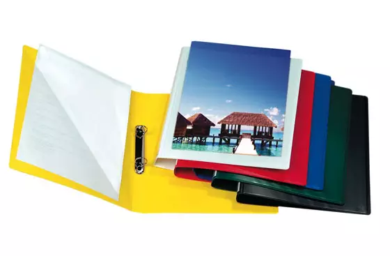 Rengaskansio läpivärjättyä 0,75 mm:n paksuista, ympäristöystävällistä polypropeenimuovia. A4 -kokoisille papereille. 2-renkainen, pyöreä mekanismi, jossa renkaan sisähalkaisija on 20mm ja ulkohalkaisija 25mm. Selkämyksen leveys 26mm. Kannessa A4-kokoinen tasku, sisäkannessa kolmiotasku sekä selkätasku. Väri musta.
