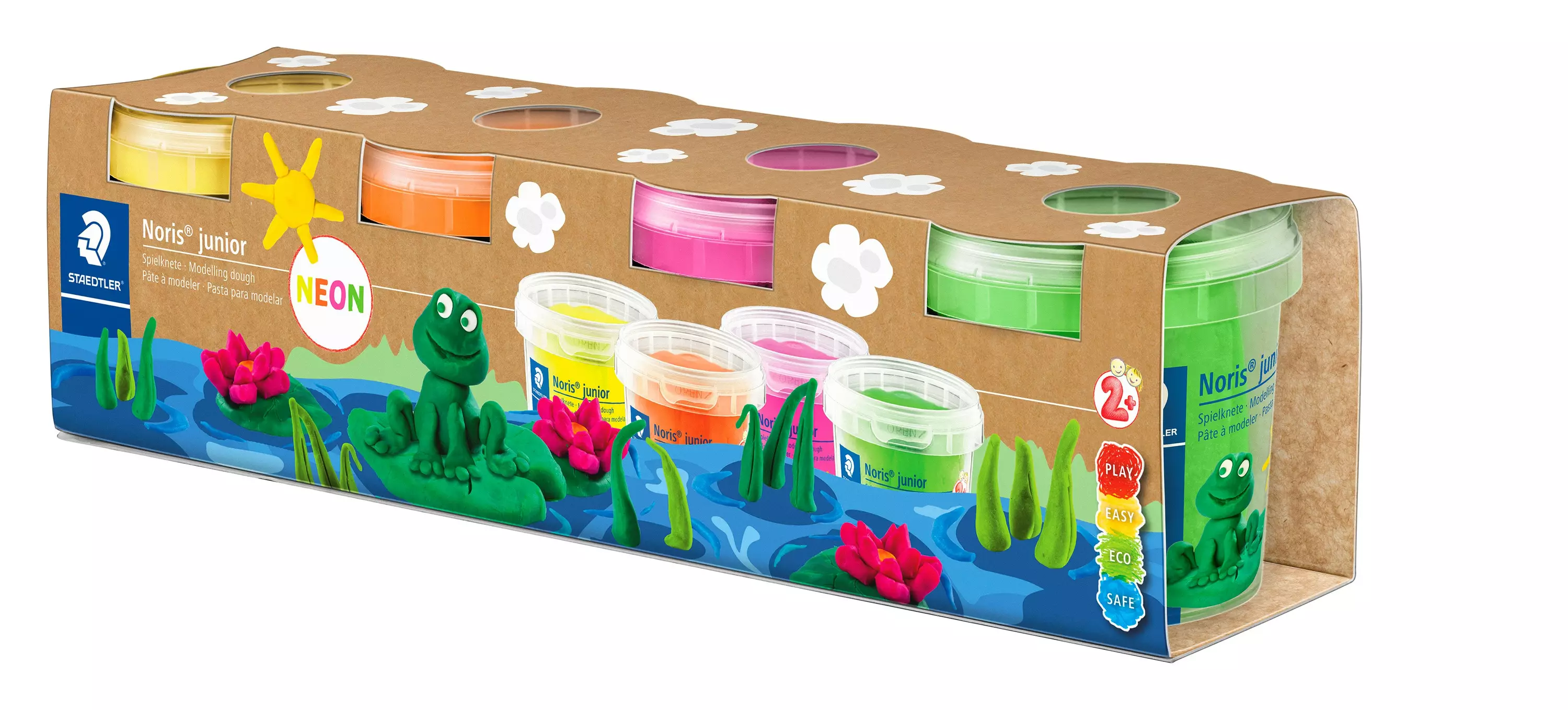 Noris junior tukee lapsia heidän ikänsä ja tarpeidensa mukaan, jotta he voivat kehittää täyttä potentiaaliaan. 2+ -valikoima tarkoittaa hauskaa leikkimistä, helppokäyttöisyyttä sekä ympäristöystävällisiä ja turvallisia tuotteita (LEIKKI - HELPPO - YMPÄRISTÖ - TURVALLINEN) • Poikkeuksellisen pehmeää ja puhdasta muovailuvahaa • Ei tartu • Sopii monille muovailuvälineille • Ihanteellinen muodon ja värin tuntemuksen kehittämiseen leikin kautta • Pehmeä taikina on helppo vaivata, leikata, sekoittaa, puristaa ja kaulita • CE-yhteensopiva • Dermatologisesti testattu • Noris junior -setti "Neonvärit" • Sisältö: 4 purkkia à 130 g neonväreillä (neonkeltainen, neonoranssi, neonfuksia, neonvihreä)