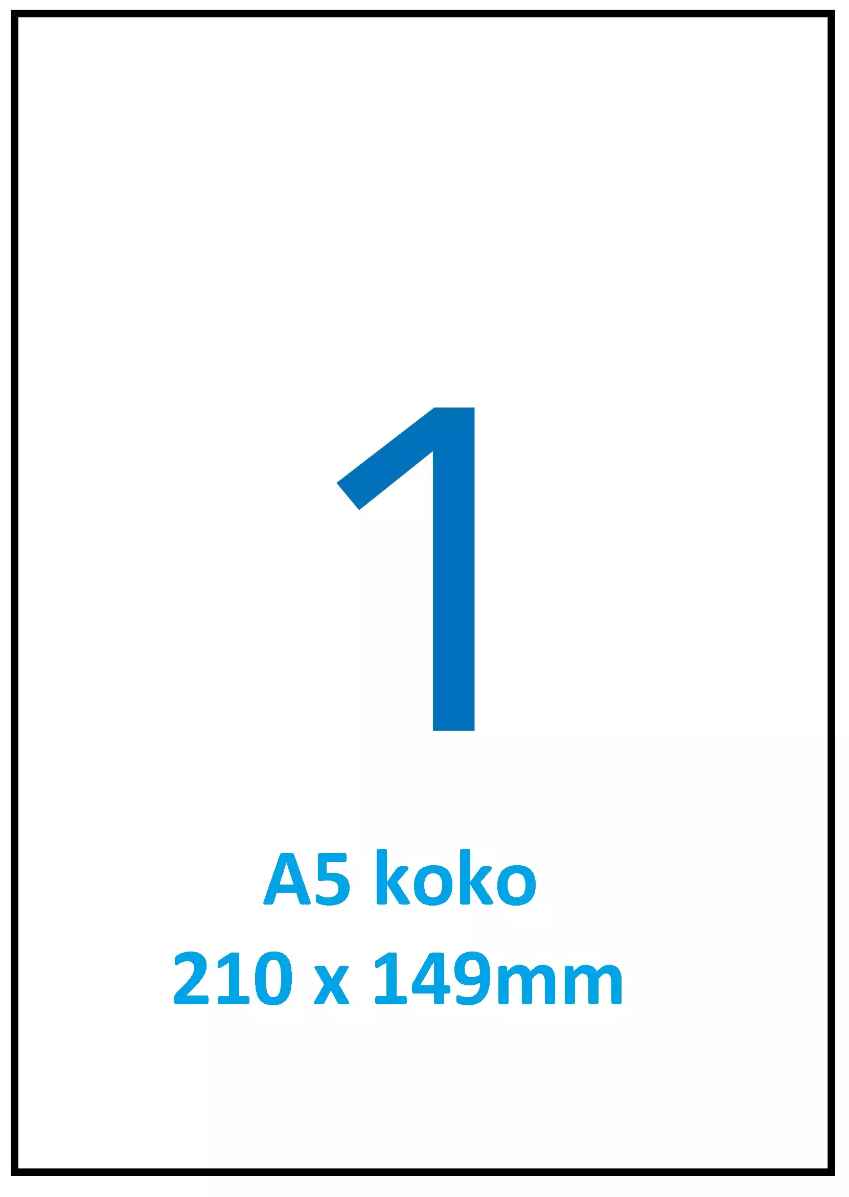 A5-lasertarra, tarraosoitekortti A5 valkoinen 210*149,2mm. Pakkaus 1000kpl. Toimii loistavasti mm. lähetystarrana.